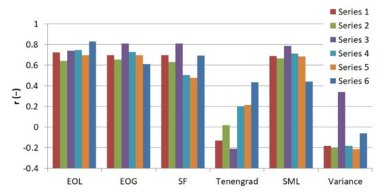 Comparison of coefficients of correlation between the values of sharpness measures (functions V′ = f(α) and V′ = f(d)) and the observers’ indications for every series of thermograms and each measure of sharpness, where V’—standardized value of sharpness measures, α—angle of focusing ring placed on the thermographic camera lens, d—distance between the thermographic camera lens and observed object.
