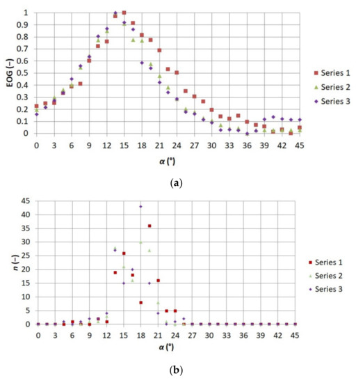 Comparison of relationship (a) between EOG measure of sharpness and the angle of focus adjustment ring placed on the thermographic camera lens α 1–3 and (b) between numbers of thermograms indicated by observers as sharp n and adjustment ring angle on the thermographic camera lens α.