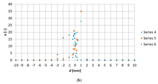 When unsharpness changed as a result of change in d, the value Δϑmax = ϑus equaled consecutively: 3.9 °C in the first series, 4.9 °C in the second series, and 5.25 °C in the third series. In the case of unsharpness changes due to changes in α, the range ϑus equaled consecutively: −5.10 °C in the fourth series, −5.9 °C in the fifth series, −6.5 °C in the sixth series. Based on the results of the experiments performed, it can be concluded that a normal distribution of probability can be attributed to quantity ϑus. Values of the estimate ϑus and the standard uncertainty u(ϑus) were obtained by means of Equations (17) and (20). The maximum range obtained from experiment (Figure 11) for each series was substituted as the upper range limit while 0 was substituted as the lower limit. The value c for the uncertainty component related to ϑus was calculated numerically in accordance with the principles described in point 2.3 and in [42]. Moreover, in this case the value u(ϑus) was calculated by means of (18). The thermographic camera lens position angle against the object under observation was not changed during the course of the works. Therefore the factor related to this angle was not considered.