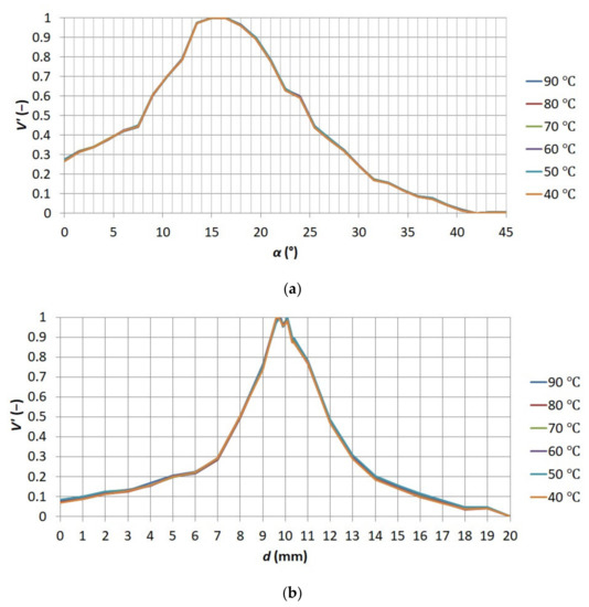 Then it was verified that the distribution of functions V′ = f(α) and V′ = f(d) did not change together with the temperature of the sensor under observation. The distribution of both functions for various values of the sensor temperature is presented in Figure 10.
