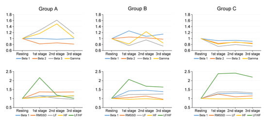 For group A surgeons, all parameters varied significantly between stages, except for beta 2, alpha waves, and BPM. (p < 0.001, ANOVA). Beta 3 levels and gamma waves remained high in all stages compared to groups B and C. Bonferroni analysis indicated that beta 3 and gamma waves were highest during the 2nd stage, but decreased as the surgery progressed (p = 0.014, p = 0.042, respectively). In addition, in group A, the LF/HF ratio remained high in the 1st stage. As the procedure progressed, the LF/HF of group A decreased to a ratio close to one. Among group B, all parameters changed significantly during surgery, except for RMSSD. (p < 0.001, ANOVA). The EEGs of group B changed significantly during surgery, except for delta wave (p < 0.001, ANOVA). Bonferroni analysis indicated that beta 1 waves were highest during the 1st stage. Gamma waves peaked at a ratio greater than one in the 2nd stage. The beta 3 waves displayed a pattern similar to that of the gamma wave, but not significantly higher than the resting state. In the 1st and 2nd stages, the LF/HF ratio maintained a value greater than two. In the 3rd stage, the ratio value decreased to ~1.5. EEGs of group C, unlike groups A and B, displayed a somewhat flat pattern, with no significant changes across stages. LF/HF ratio increased from 1st to 3rd stage, with the higher levels of LF/HF ratio in the 3rd stage (p = 0.002) (Table 1, Figure 2).