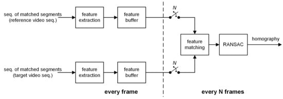In this section, a homography estimation method on a multi-frame basis is proposed to stitch matched segment pairs in static video camera environments. The proposed method is performed on every matched segment pair. For each side of the video sequences, as shown in Figure 2, feature points are extracted from the matched segment pair over an interval N using the SURF algorithm []. The extracted feature points are saved in the feature buffers until the end of the interval. Then, using the buffered feature points, a homography for the matched segment pair for the interval is estimated throughout feature matching and RANSAC [].