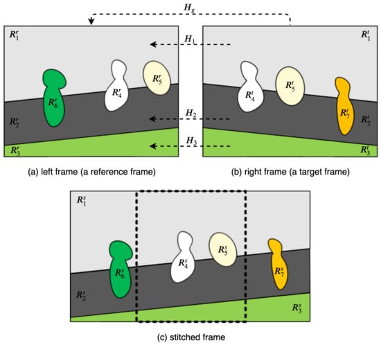 Yoon et al. estimated an initial homography between the first frames of a video sequence pair for stitching []. The homography for the following frame pair is calculated using the recent homography and the movement component of each camera. For the reduction of misalignment distortion, the homography is improved through block matching around feature points warped to the stitching frame plane. However, the accuracy of the homography for the following frames is affected by that of the initial homography. Additionally, when pixels in regions have different depths, misalignment distortion may occur due to inaccurate homography.