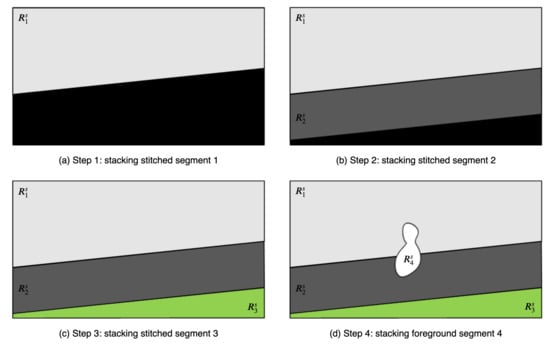 If all processes of segment-based stitching and warping are performed, there are background stitched segments, warped non-matched segments from the target frame, and foreground or non-matched segments from the reference frame. These segments are stacked on the reference frame plane. First, background stitched segments are stacked according to the area of the segments, in descending order. Thereafter, foreground and non-matched segments are stacked irrespective of the order. In Figure 4, the stacking order of background stitched and foreground segments is shown. In this example, to synthesize the stitched video frame, the proposed algorithm stacks the segments in the order of , , , and . Then, the remaining unused segments are stacked as , , and . The sequence of stacking foreground and non-matched segments is random.