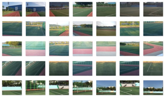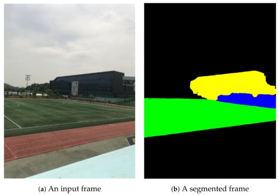 The proposed video stitching method was implemented using the C++ programming language and OpenCV functions related to feature extraction, matching, and RANSAC operations []. The proposed method targets sports stadiums with running tracks enclosing a soccer field. For the training of the semantic segmentation tool, DeepLab, the training image dataset in Figure 5 was constructed; the dataset consists of 380 images captured at different locations with different viewing angles in a sports stadium located on a university campus. Five classes were defined for semantic segmentation: ground, goalpost, building, human, and other. Ground truths for semantic classes of segments were generated for every image for DeepLab training []. Figure 6 shows the results of semantic segmentation for test video sequences captured in the target sports stadium.