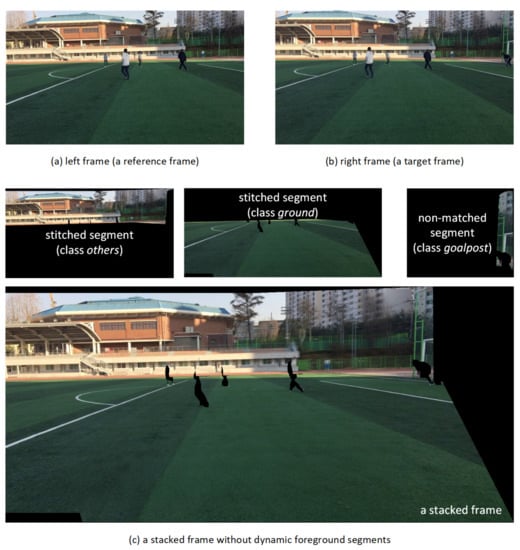 Each video frame is segmented into five semantic classes. In the target environment of this study, the foreground segments are human objects in the general sports stadium. For the foreground segments, it is difficult to estimate the homography consistently over a time interval because a sufficient number of feature points cannot be extracted. Thus, as described in Section 3.3, for each human object, the left foreground segment is selected without warping. For the other segments, the stitched segments are used for the composition of the final stitched frame.