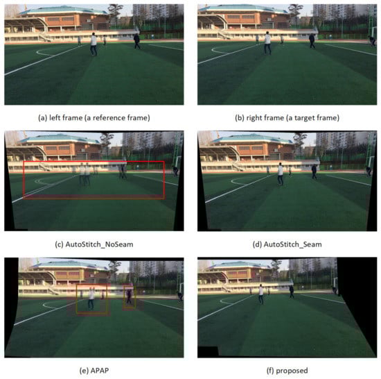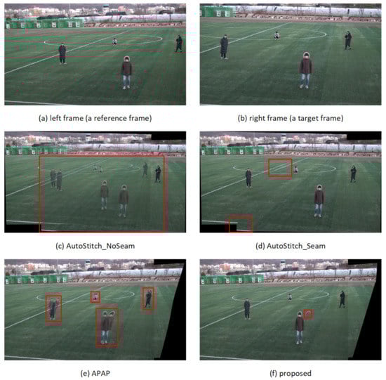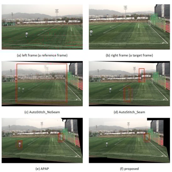 The AutoStitch_Seam method selects a seam showing little change between its left and right pixels and warps the pixels in the video frame selectively based on the seam. Therefore, no misalignment distortion of the foreground segment is noticeable. However, since a segment having a plain texture, such as the ground of the stadium, has no significant signal change in any direction, a wrong seam is likely to be set. In Figure 9d, Figure 10d and Figure 11d, there is misalignment distortion in the ground and other segments due to the incorrect seam. Only in seq1 in Figure 8d is misalignment distortion not noticeable with the seam.
