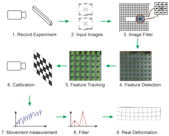 The first part of the proposed methodology is summarized in Figure 1. A computer vision technique is applied to estimate displacement in different parts of an analyzed object. The first images from the object to be analyzed are captured over time using a single camera. In step 2, the images are stored and then filtered in step 3. The filtered images undergo feature detection in step 4. Those features will be used to track deformation along time, as represented in step 5. In this stage, the position of each feature in each image is stored in an organized fashion. Note that this information already represents the movement of different parts of the structure in the camera space. Therefore, the camera calibration process (step 6) is used to estimate homograph matrices and transform the feature positions to real-world measurements. In step 7, sets of points data are combined to allow movement estimation for each object’s region under deformation. The movement information is filtered in step 8 to eliminate errors. At the end (step 9), data are combined into a displacement vector for each part of the analyzed object.