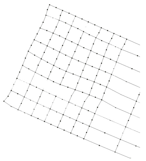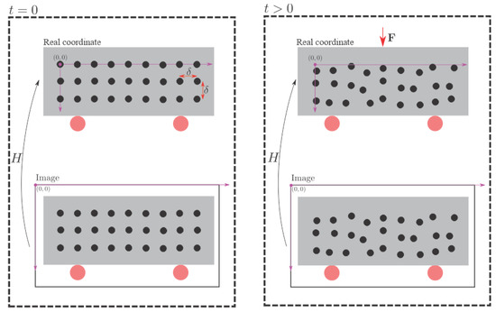In Equation (1), e are the coordinates x and y of the circle located in the i-th row and j-th column. The variable is a scale factor. Note that it takes at least four points to find the H matrix. The matrix H is calculated in , that is, before the bar undergoes any deformation caused by the external force. For , it is still possible to detect the circles in the image using the Hough transform. However, it is not possible to know the circles’ arrangement in the global coordinates. In this way, it is not possible to compute the H matrix during the experiment. However, the matrix calculated in is still valid in case the camera remains fixed throughout the experiment. Thus, the new circles’ position in the global coordinates can be found only by multiplying the matrix H by . Therefore, the circle’s displacement located in the i-th row and j-th column at the time is given by the Equation (2), where, in the image, e are the coordinates x and y of the circle located in the i-th row and j-th column at time t. Figure 2 illustrates the proposed methodology for calculating displacements in two dimensions. Note the use of matrix H in the figure.