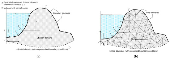 Specifically to highlight the relevance of applying the boundary element method, instead of the finite element method, along with the SFM-based imaging technique as well as with any other imaging technique, one considers the generic models depicted in Figure 3. Assuming generically that the whole boundary of the boundary-element model (see Figure 3a) is subdivided into a part with prescribed displacements, , and unknown boundary tractions, , and another part with both known displacement, , and tractions, , the system of Equations (8) may be written in partitioned form as