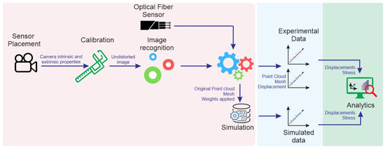The experimental process is composed of three main steps, as represented in Figure 6. In the first step, the experimental setup, which is explained in this section, is regarded, and sensors are placed and calibrated. Then, the experimental data are gathered using the many sensors placed at the specimen. Simultaneously, in this second step, a simulation is performed using the parameters obtained during the experimental setup. Finally, in the third step, the data gathered from all these sources are analyzed.