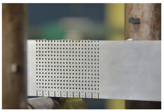 The computer vision part of the methodology was implemented in MATLAB. The experiments consist of image matching processes, feature extraction, matching visual descriptors, and matching three-dimensional points. A camera was placed in front of the experiment bar to monitor the displacements of the black circles, as shown in Figure 7. In addition, for reference, the circles were numbered from 1 to 270.