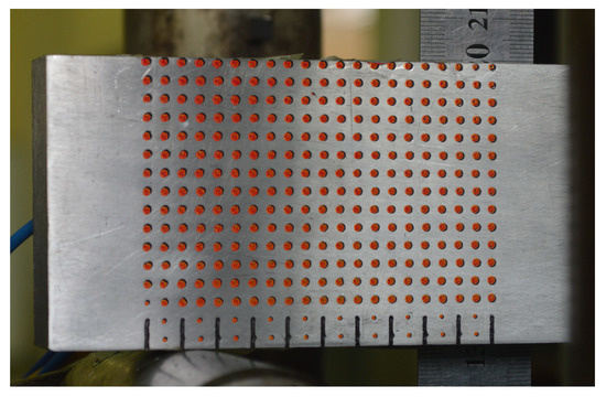 The above-described process is applied here, considering an aluminum bar with known dimensions, which is considered the object of interest for monitoring displacements. The proposed method for deformation calculation uses a fixed camera and a pattern painted on the surface to be monitored. The chosen pattern consists of an grid of circles with radius r, and the distance between each circle is . This pattern was used because it is easy to be constructed, and there are well-established methods for detecting it in an image. In this sense, circles with known sizes and positions were painted on this bar.