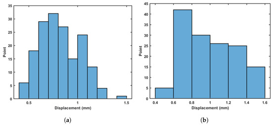 Using these new displacements, it is also possible to build a histogram of movement only due to bar deformation. Figure 9a shows this result. Observe that this movement is very small in comparison with the histogram of Figure 9b. Note that the error due to photogrammetry will be double the value calculated previously (i.e., mm) once the two measurements are combined to form this result.