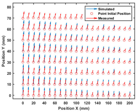 The histograms allow a quantitative visualization of the observed deformation. However, to visualize the movement direction of each point, Figure 10 shows the total displacement of each point. The arrow represents the movement direction, and its length gives an idea of its module. Note that in blue, the simulated values are close to the measured ones in red.