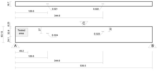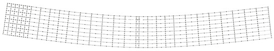 In the first analysis (BE analysis I), only the displacements photogrammetrically measured at the three supports A, B, C of the bar (see Figure 13 and Table 2) were considered as prescribed boundary conditions, and the bar was solved by applying a homemade BEM computer code, capable of analyzing stresses in 3D solids. The aspect of the deformed bar at the final load level in the test (610) is shown in Figure 14. The corresponding results in terms of displacements and stresses at an internal plane positioned at half the width of the beam are shown in Figure 15a and Figure 16a, respectively. In the second analysis (BE analysis II), in addition to the support displacements given in Table 2, the displacements measured on the hatched area by using the SFM technique and shown in Figure 10 were considered as well in the BE analysis. In fact, as the BE mesh corresponding to the hatched area has fewer nodes than the number of points considered in the experiment in that area (depicted in Figure 10), a 2D regression technique has been applied to project the photogrammetrically captured displacements on the adopted BE mesh. This process optimizes the displacement values at the nodes of the BE mesh based on the photogrammetrically measured values. In Figure 17, part of the deformed beam that includes the SFM measured displacement data is shown. In addition, the vertical displacement components and normal stress obtained in this analysis for the same internal plane mentioned above, at half the beam width, are presented in the color plots in Figure 15b and Figure 16b, respectively.