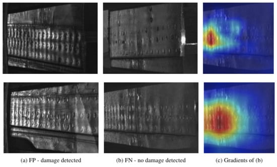 Here, we provide two sets of eight examples in Figure 9, the first two rows correspond to the deep model DenseNet-201 and, the latter, stand for the lightweight model SqueezeNet. The network learned to identify the regions of highest-stress, that is, where the planarity of the fuselage appeared not to be smooth in comparison to its neighbors.