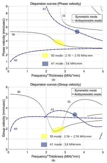 In Section 1, many recent studies on Lamb wave physical phenomena are introduced. Lamb wave propagation presents problems associated with wave fluctuation and speed in a homogeneous isotropic material. In terms of the vibrating motion, two wave modes are indicated in the Lamb wave case: a symmetric mode and an antisymmetric mode. The wave mode and speed are defined by velocity of the bulk wave, wave number, and frequency. Most theoretical equations are explained by Rose et al., Cawley et al., and Viktorov et al. [1,2,3]. In this study, the generable frequency range was 300–600 kHz. A higher frequency range (over 1 MHz) wave signal was not suitable for evaluating the assessment of thick plates, owing to insufficient energy maintenance. To begin the experimental investigation, the most crucial step was mode selection using dispersion curve analysis. The dispersion curve was drawn using the bisection [1]. Considering excitation frequency, S0 wave mode was assumed to satisfy Lamb wave modes, based on previous research [13]. The dispersion curve diagram, based on eigenvalue analysis, is illustrated in Figure 1.