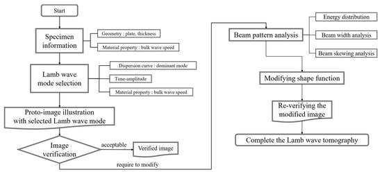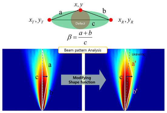 The modification concept is structured by considering the proper wave mode selection, evaluation of the quality of images, and sound beam pattern analysis. In beam pattern analysis, the wave energy, distributed on the specimen, is the most crucial factor in figuring out the beam path and beam-skewing. The first step is the verification of wave modes. The dominance of mode and the intensity of wave signal are kernel items to consider. The second step is illustrating the image by application of the RAPID algorithm. The reliability of defect images is discussed fully considering distortion effects. In the case of distorted images, the beam pattern analysis is conducted by considering energy distribution, beam width analysis, and beam skewing analysis. The modified shape function is calculated by the rules of the proposed beam pattern analysis and modification technique. And the last step is re-verification. The results of beam pattern nature present the basic information of modifying shape function. The total process of modifying the shape function is explained as shown in Figure 3.
