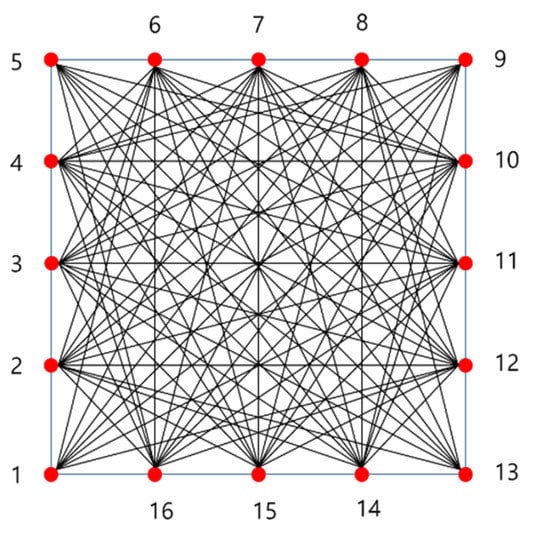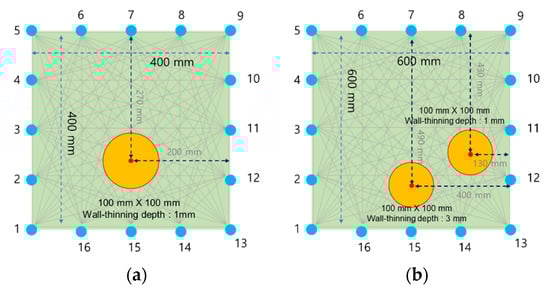 The aim of this study was to verify an appropriate mode verification and determine a revised shape factor for defects. To determine the appropriate Lamb wave modes, a relatively bulkier plate was used for the study specimen. For a thickness less than 3 mm, mode identification requires more sophisticated signal analysis. To reduce the disturbance or instrumental error, a low frequency-based wave signal is preferred. In contrast, propagating distance and wave signal attenuation effects are likely to occur in the case of a thicker plate. As per the discussion about the physical meaning of Lamb waves in Section 2, antisymmetric modes are significantly affected by the transverse wave, which is related to the bending effect. Antisymmetric Lamb wave modes are sufficiently excited in the bulky plate case. Recent studies using a treated containment liner plate indicated that a plate with thickness 6 mm is acceptable for Lamb wave propagation [15,16,17]. The specimen information is shown in Figure 4. The carbon–steel plate was composed of SA516 GR 60 material, and its thickness was 6 mm. The dimensions of the plate (width and height) were 400 × 400 mm and 600 × 600 mm with a maximum propagation distance in the range of 141–848 mm. To collect sufficient wave signals, the transducer arrays were located as shown in Figure 5. To address fundamental SHM application concerns, robotics or built-in sensors should be considered. Accordingly, in light of the attenuation of the Lamb wave and the illustration of a maximum-sized tomography, a total of 16 transducer sets were deployed, and 160 wave signals were treated by each local section. At the end of these processes, reconstructed images were obtained through a combination of cross-correlated wave amplitudes.