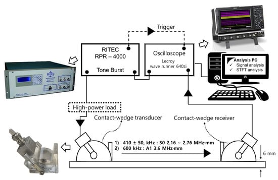 To acquire the Lamb wave signal, a piezoelectric transducer (PZT) was applied to the CLP mock-up specimen. The PZT (standard square shape, 12.7 × 25.4 mm2) exhibited a center frequency of 400 kHz; its frequency range was 320–580 kHz. Considering availability on wave propagation, a contact-based experiment was performed using an acoustic couplant, instead of a noncontact method. The transducer was manually fixed on the wedge using a pressure of 186 kPa. From an application viewpoint, the noncontact technique was required to excite a wave signal. To determine the best excitation condition, the contact-based transducer array had to determine the feasibility of the most appropriate mode in advance.