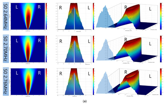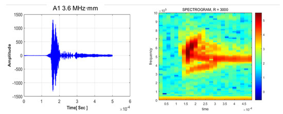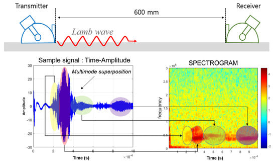 To choose the most prominent mode for illustrating quantitative images, the revised RAPID algorithm with a modified shape factor was employed. The short-time Fourier transform (STFT) method was applied for mode verification; this method determined the frequency and wave speed of the signal. Analysis of the waveforms and STFT revealed that for frequencies ranging from 2.16 to 2.52 MHz in the symmetric mode case, wave dominance was rarely indicated with the mode superposition effect. The procedure of signal analysis was investigated considering group velocity and mode dominance. The dominance of mode is a significant factor when applying the Lamb wave inspection technique. Each mode’s sensitivity is different, which can affect evaluation defects. The basic concept of the process is illustrated in Figure 7. For waveform analysis, multiple wave signals were simultaneously generated in the plate. Results of the STFT and waveform analyses are demonstrated in Figure 8. Waveform analysis of the 2.64–2.76 MHz range indicates that the waveform and frequency show good dominance of excitation. In addition, noise and disturbances rarely appear in the spectrograph.