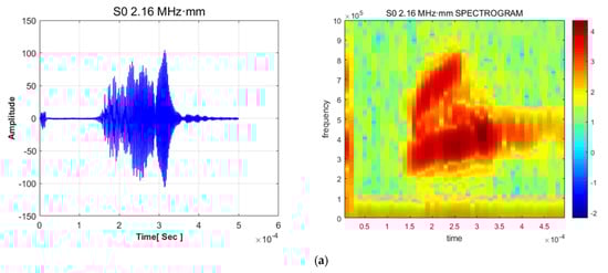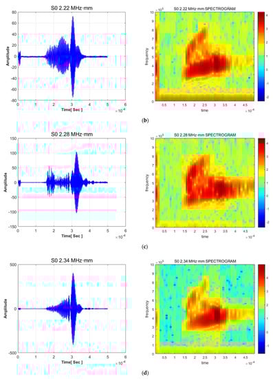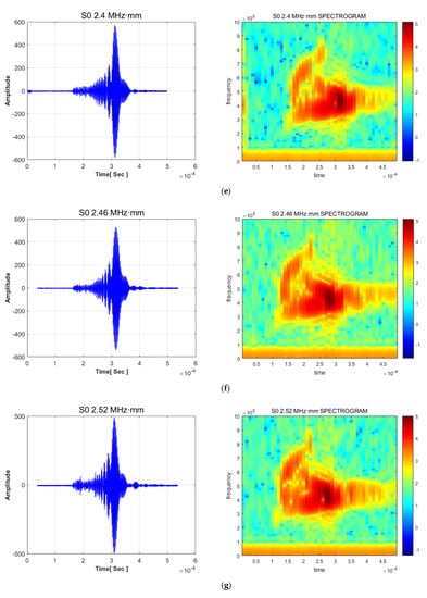 Results of STFT and waveform analyses for symmetric Lamb wave modes: (a) S0 2.16 MHz·mm, (b) S0 2.22 MHz·mm, (c) S0 2.28 MHz·mm, (d) S0 2.34 MHz·mm, (e) S0 2.40 MHz·mm, (f) S0 2.46 MHz·mm, (g) S0 2.52 MHz·mm, (h) S0 2.64 MHz·mm, (i) S0 2.70 MHz·mm, and (j) S0 2.76 MHz·mm.