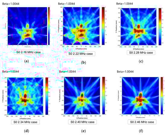 Tomographic images for S0 2.16 to 2.46 MHz·mm: (a) S0 2.16 MHz·mm, (b) S0 2.22 MHz·mm, (c) S0 2.28 MHz·mm, (d) S0 2.34 MHz·mm, (e) S0 2.40 MHz·mm, and (f) S0 2.46 MHz·mm.