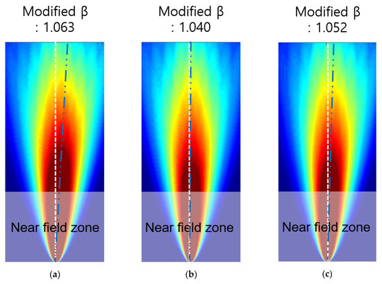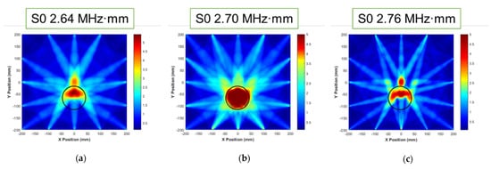 Revised shape function of variable β for RAPID tomography: (a) S0 2.64 MHz·mm, (b) S0 2.70 MHz·mm, and (c) S0 2.76 MHz·mm.