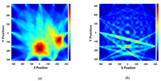 Finally, the tomographic image amplitude at each pixel is calculated as the linear summation of the location probabilities for each transmitter and receiver pair; the total number of transmitter–receiver pairs is denoted by . The tomographic image amplitude is calculated using the equation: