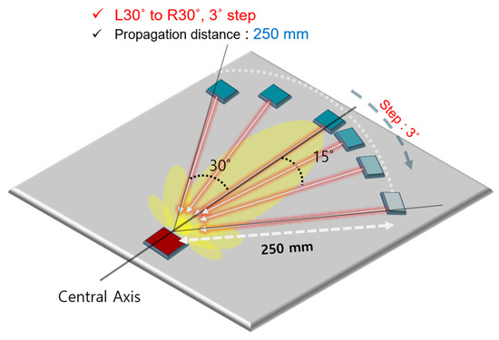 The beam width selection method is depicted in Figure 13. The energy level was measured at 3° intervals within 30° from the central axis. Measurements were conducted over a certain distance in the far-field section, but not in the near-field zone. The far-field zone was set to an area that was farther than two wavelengths from the sound source, and the group speed was about 1800 m/s. Therefore, it was regarded as far-field when the detection distance was 14 mm or longer at λ = 6.67 mm, for S0 2.70 MHz·mm. The measurements in this experiment were performed at a distance greater than 250 mm from the excitation source, which could be viewed as far-field.
