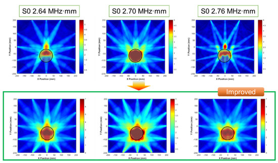 For significantly dominant wave modes, the tomographic results were investigated for the same defect; the results are depicted in Figure 10. Compared with the previous results (shown in Figure 9), the quality of the images is enhanced. These results are used to revise shape accuracy and reliability. The case of S0 2.70 MHz·mm can be illustrated as a shape relatively similar to the detected shape. It was assumed that the suitable wave mode can be determined through a comparison with the other dominant modes.