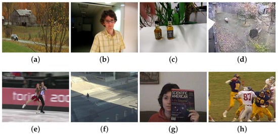 In the experiment, we select eight video sequences from the Visual Tracker Benchmark (VTB) dataset [9] (http://cvlab.hanyang.ac.kr/tracker_benchmark/datasets.html, accessed on 7 June 2021), which is shown in Figure 3. These sequences have attributes such as scale variation, occlusion, deformation, and out-of-plane rotation, which are all representative in object tracking tasks.