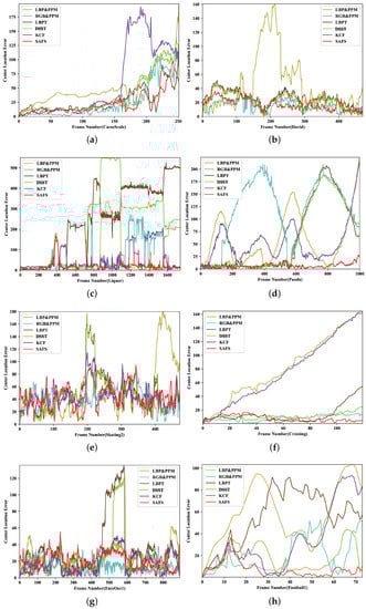 Table 3 lists the center location errors of 8 sequences using 6 methods, respectively. Our SAFS algorithm achieves the lowest average center location error which is 18 pixels. In addition, we display the results of the center-pixel location error frame by frame for eight sequences, as shown in Figure 4. The red line representing SAFS is always at the bottom of the figure, which means that its average CLE is minimal. Experimental results show that the algorithm can achieve robust tracking of the object when the object or scene changes. It should be pointed out that in the process of updating the target template, template drift still exists, which affects the tracking effect to a certain extent.