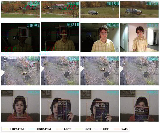 Our algorithm can adaptively select features between color and texture. In order to show the advantages of our self-adaptive algorithm, we select two algorithms that track only one feature and use them as baselines for comparison. We compare SAFS algorithm with the maximum posterior probability iterative tracking algorithm using texture feature alone (LBP&PPM) [21] and color feature alone (RGB&PPM) [21]. In addition, considering that SAFS is not based on deep learning, we should compare it with some classic algorithms. Therefore, we add three state-of-the-art traditional algorithms in the comparison, which are the mean-shift algorithm using the joint color-texture histogram (LBPT) [28], discriminative scale space tracking (DSST) [13] and high-speed tracking with kernelized correlation filters (KCF) [29]. All the algorithms are designed to track one object in our experiments.