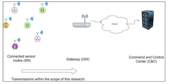 We define the system as a wireless sensor network, consisting of wireless, spatially distributed, fixed-location sensor nodes and a gateway. The purpose of the sensors is to transmit real-time measurements to a command and control (C&C) center, via the gateway (Figure 1). The sensors are battery powered and should be as cheap as possible in order to be deployable in numbers. As such, they should implement only the minimal subset of required functionalities.