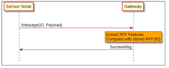 In Figure 4, the message was not successfully authenticated by its RFF. This can happen in several cases: the SN has never been authenticated before, and so, the GW never stored its RFF; the RFF was not matched; and of course, it may happen in the case of an adversarial (malicious) transmission.