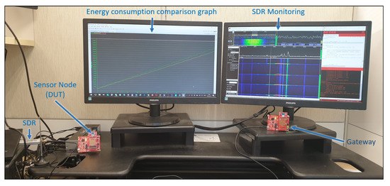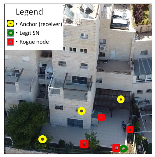 From an end-to-end perspective, the evaluation system consists of several sensor nodes communicating with a computer. One of the node is a legit SN, which sends “sensitive” messages, while the others are “rogue” nodes, which send similar messages. The role of the computer (“GW”, since it is playing the role of the GW in our protocol) is to differentiate between the legit one and the rogue ones. The legit SN stays at a fixed location in an outdoor environment, as is the case for numerous scenarios, as explained in Section 3. The rogue nodes may be fixed or mobile.