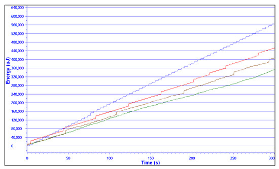 Figure 11 shows the energy consumption graph of this setup over 5 min. Due to the first full authentication, the hybrid protocol was a little more energy-demanding at the start of the experiment. However, after only six transmissions, the total energy used by the MAC-only protocol was equivalent to that of the hybrid one, and after that, the advantage of the hybrid approach was apparent and grew almost linearly.