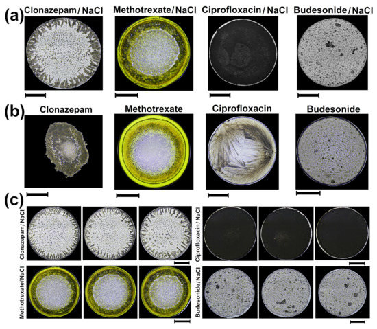 Patterns in dried droplets of medicines (a) Patterns of dried droplets of Clonazepam, Methotrexate, Ciprofloxacin and Budesonide with NaCl formed at 63 C (RH = 25%). (b) Patterns of dried droplets of Clonazepam, Methotrexate, Ciprofloxacin, and Budesonide without NaCl formed at 63 C (RH = 25%). (c) The high reproducibility in the pattern formation of Clonazepam, Methotrexate, Ciprofloxacin and Budesonide with NaCl. The length of the black lines indicate 1 mm.