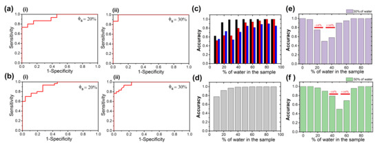 Receiver Operating Characteristic (ROC) curves. (a) (ROC) curves plotted from the entropy analysis of the crown in Methotrexate/NaCl patterns formed with varying ratios of tap water (i) 20, and (ii) 30%, respectively. (b) The ROC curves plotted from analysis of the normalized crown thickness of Methotrexate/NaCl patterns produced with varying ratios of tap water (i) 20, and (ii) 30%, respectively. (c) Accuracy for entropy estimated in different regions of Methotrexate/NaCl patterns: the crown (black), the center (red), and the complete deposit (blue). (d) Accuracy for the normalized crown thickness of Methotrexate/NaCl patterns. Accuracy for classifying groups of drug diluted with water at (e) 30% and (f) 50% by using entropy analysis of the crown in Methotrexate/NaCl patterns.