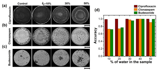 Recognition of Criprofloxacin, Clonazepam, and Budesonide. Patterns of dried droplets of (a) Criprofloxacin/NaCl, (b) Clonazepam/NaCl, and (c) Budesonide/NaCl produced by different dilutions of tap water. Patterns formation was carried out at = 63 C, and RH = 25%. The length of the black lines indicate 1 mm. (d) Accuracy for different medicines: Criprofloxacin/NaCl (red), Clonazepam/NaCl (orange), and Budesonide/NaCl (green). Texture analysis was carried out using different parameters: entropy of the entire deposit, entropy at the center of the deposit, and the superficial area of the aggregate formed in the center of the deposit, respectively.