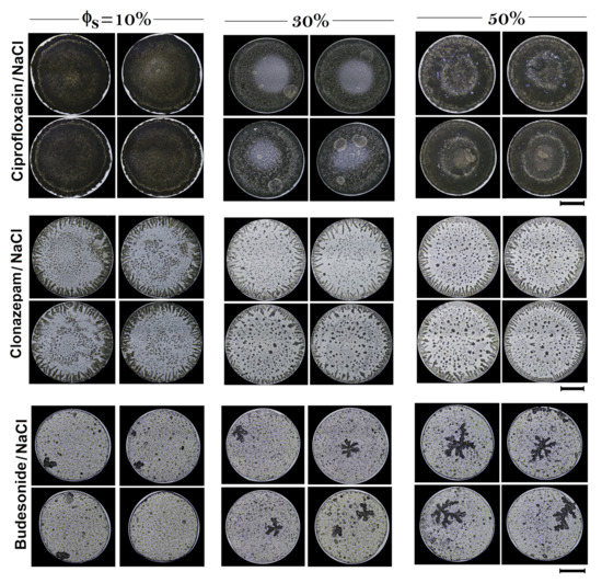 Reproducibility of patterns in dried droplets of Criprofloxacin/NaCl, Clonazepam/NaCl, and Budesonide/NaCl produced by different dilutions of tap water. Patterns formation was carried out at = 63 C, and RH = 25%. The length of the black lines indicate 1 mm.