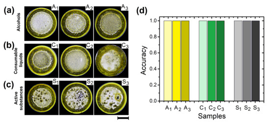 Recognition of Methotrexate containing different substances Patterns in dried droplets of Methotrexate/NaCl produced by the addition of 10% of (a) alcohols (ethanol(), methanol(), and isopropanol()), (b) consumable liquids (rehydrating serum(), carbonated drink(), and liquid detergent ()), and (c) medicines (Folic acid(), Diclofenac (), and Acetaminophen()). The relative concentration of the three medicines and Methotrexate in the final sample is 1:10, w/w. The control parameters in pattern formation from the evaporation of droplets were: = 63 C, and RH = 25%. The black line indicates 1 mm. (d) The corresponding Accuracy for the three groups of substances based on the entropy of the entire deposits.