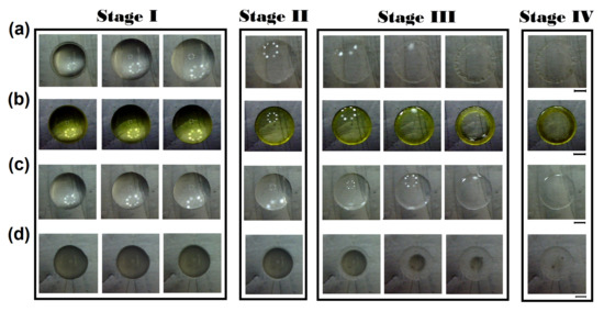 Pattern formation of drug deposits. Pattern formation of (a) Clonazepam/NaCl (t = 0, 45, 300, 1650, 1800, 1950, 2100, and 2130 s), (b) Methotrexate/NaCl (t = 0, 30, 60, 135, 150, 165, 180, and 240 s), (c) Criprofloxacin/NaCl (t = 0, 30, 45, 60, 75, 90, 105, and 150 s), and (d) Budesonide/NaCl (t = 0, 30, 45, 60, 105, 165, 180, and 240 s). Labels I, II, and III indicate three stages of formation: increasing in contact area of the droplet, recirculating flow, and the emergence of the stain pattern, respectively. Label IV corresponds to the residual pattern deposit. The diameter of the final deposits are 3.6, 3.15, 3.25, and 3.2 mm, respectively. Pattern formation from the evaporation of droplets was carried out at = 63 C, and RH = 25%.