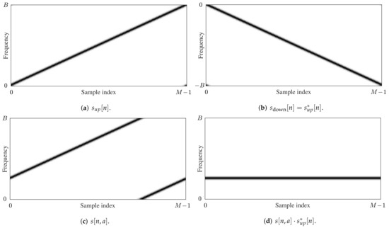Spectrograms of the waveforms for an up-chirp , a down-chirp , an arbitrary LoRa symbol s[n,a], and the product as applied in (4), for K = 1 and N = M.