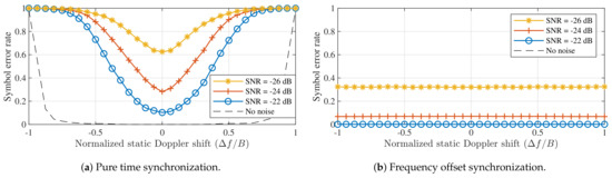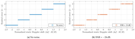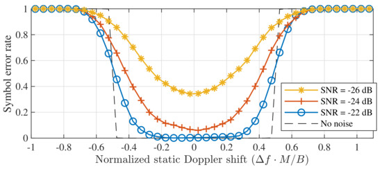 A few interesting points are demonstrated in Figure 5. First, it is shown that symbol detection performance is significantly better when applying an appropriate frequency offset instead of purely relying on time synchronization. In fact, in the latter case, symbol errors are observed for all non-zero static Doppler shifts when no noise is present. However, note that applying an appropriate coding strategy is expected to relieve part of this problem. When applying a correct receiver frequency offset, the same symbol error rate is observed for all applied Doppler shifts.