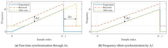 However, note that the discrete symbol errors shown in Figure 2 will only occur when the down-chirp is perfectly time-aligned. If the receiver performs any form of synchronization based on the timing of the pilot sequence in the packet’s preamble, this frequency mismatch will at least be reduced to the interval , mitigating the discrete symbol errors shown in Figure 2 if no noise is present. In practice, this very rudimentary form of synchronization introduces a relative time shift , equal to , as illustrated in Figure 4a. Unfortunately, countering the frequency shift solely with a time shift results in the loss of some symbol energy as the received chirp is not aligned with the frequency range expected by the receiver. Moreover, the detection is performed in the presence of a timing error , causing some intersymbol interference. Therefore, frequency errors larger than about cannot be handled when using this synchronization strategy.