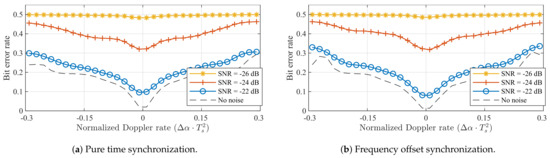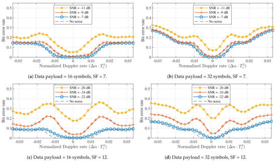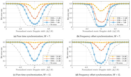 Figure 5 illustrated that applying frequency offset synchronization results in better SER performance than employing pure time synchronization. The disparity in performance between both strategies is also apparent in the results for the simulated receivers. In Figure 6a,c, bit errors are again observed for all non-zero Doppler shifts, even when no noise is present. In contrast, the BER is very low for normalized Doppler shifts in the range presented in Figure 6b,d. The limits of this range correspond to relative velocities around 4320 /. Therefore, static Doppler immunity is observed to be very high. Additionally, when no noise is present, Doppler immunity is slightly better for SF = 12 than for SF = 7. At very low SNRs, the comparison between spreading factors is less straightforward, mainly due to the differences in SNR performance.