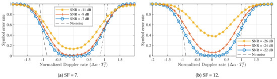 For a single LoRa symbol transmitted and received in realistic acceleration conditions, this Doppler rate is expected to have almost no influence on the performance of the symbol detector. After all, using this kind of slope offset is equivalent to communicating with a receiver utilizing a slightly different chirp rate. The symbol error rates observed for SF = 7 and SF = 12 are shown in Figure 7. These were acquired by synthesizing LoRa packets with a slope and applying these packets to a symbol detector with a perfectly time-aligned down-chirp and no chirp rate offset. In this figure, the Doppler rate is normalized through . Figure 7 confirms that the symbol detector is very robust against constant Doppler rates. In fact, when no noise is considered, errors are only observed for normalized Dopper rates outside . These rates correspond to acceleration values of 285 / and 285 /. While the Doppler rate immunity for SF = 12 is three orders of magnitude worse than the one for SF = 7, both of these acceleration values are quite unrealistic in practice.